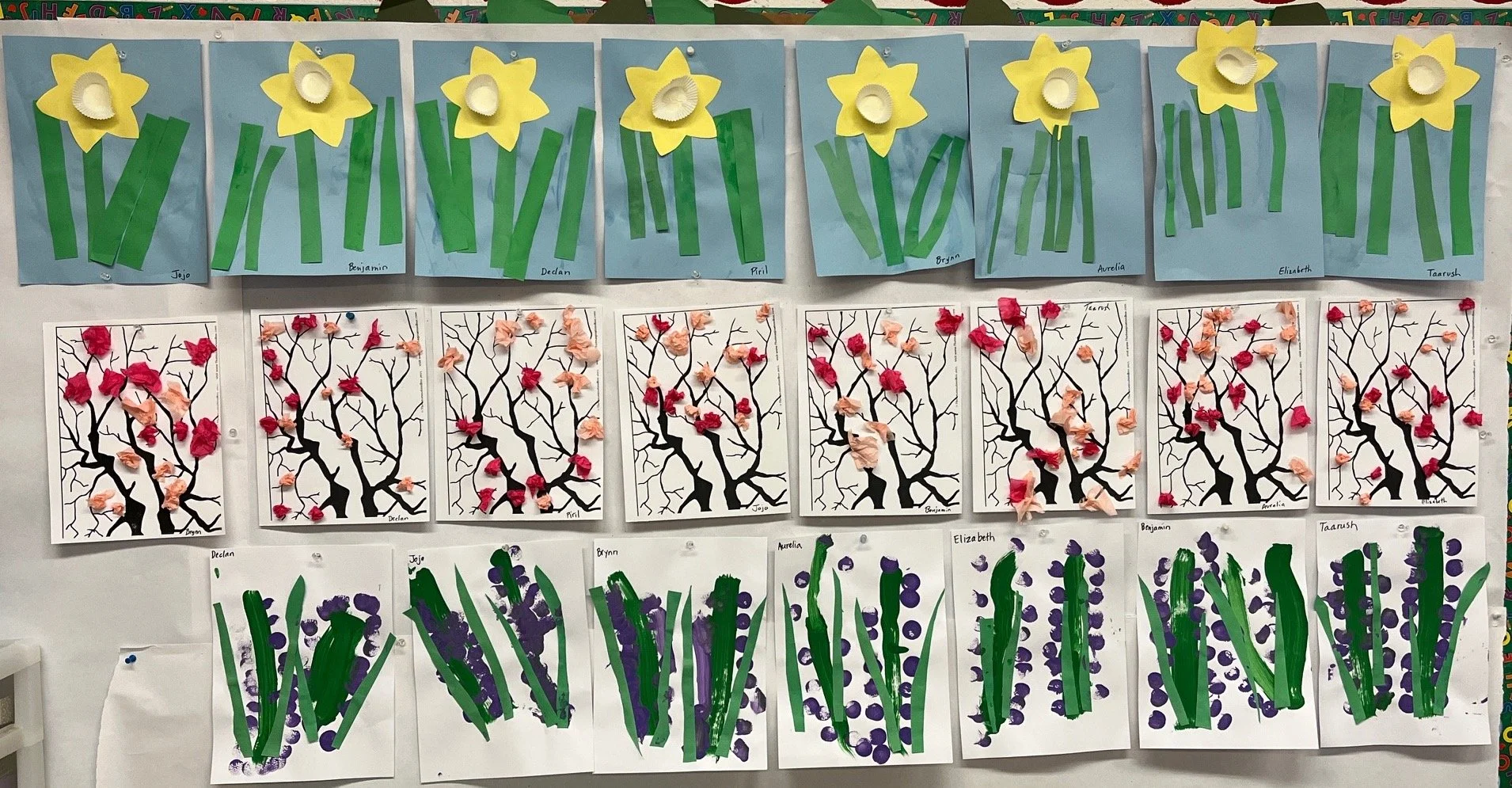 In addition to the daffodils, the children made pussywillows, hyacinths, and cherry blossoms. Our bulletin board (below) is a pleasure to look at.