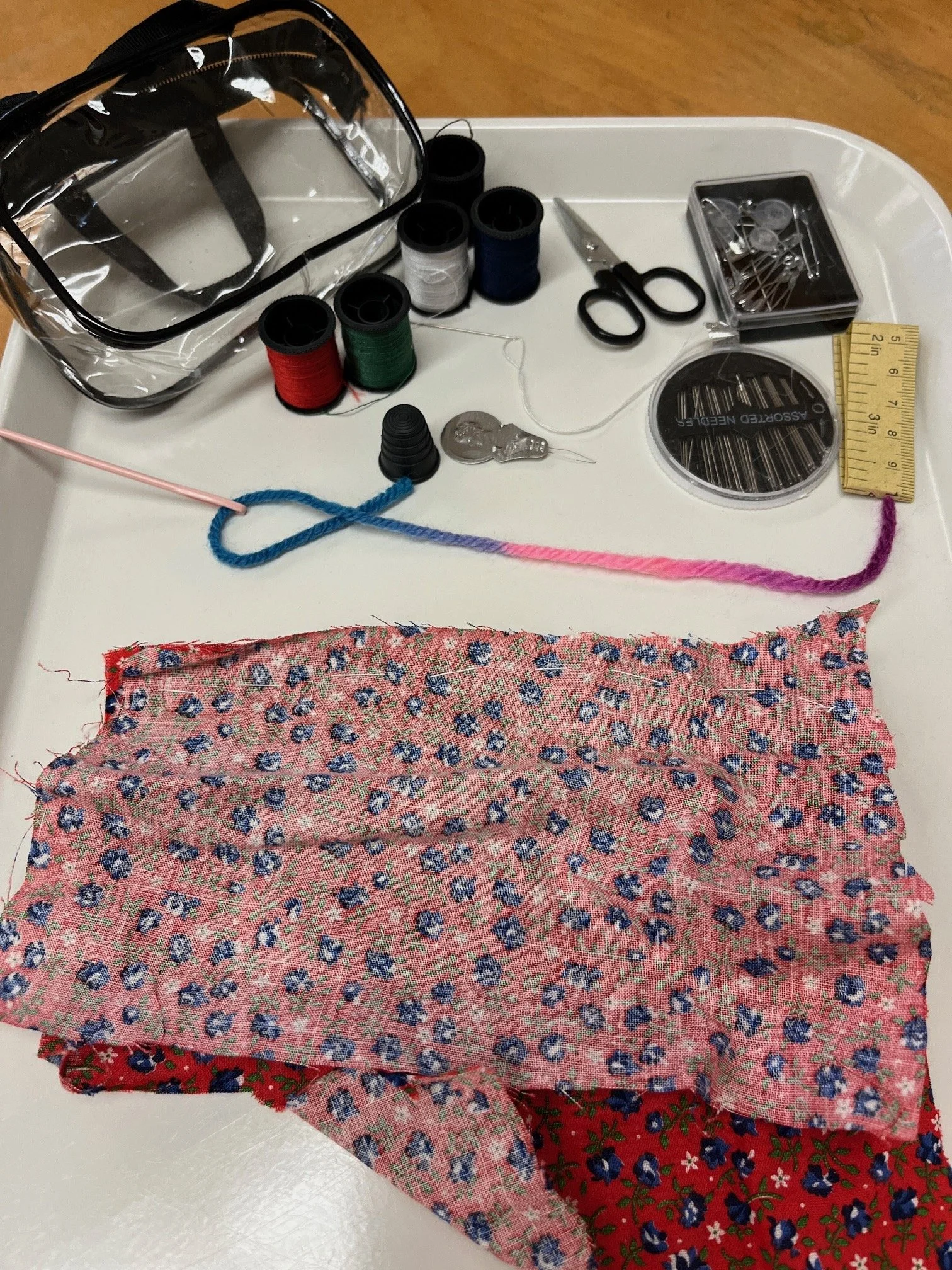On Thursday, instead of going to the wet playground, the children had a sewing lesson. When I said the word ‘thread’, many children asked “What is thread?”. When they made Corduroy’s pocket, they used a plastic needle and yarn. I pulled my little sewing kit (I called it a baby purse) out of my cabinet and put everything on the tray. Many of the children called out “My mommy has that.” I showed them each object in the sewing kit and then used the needle and thread to sew two pieces of cloth together. I was glad to use the sewing kit because it has been untouched in my cabinet for 15 years.