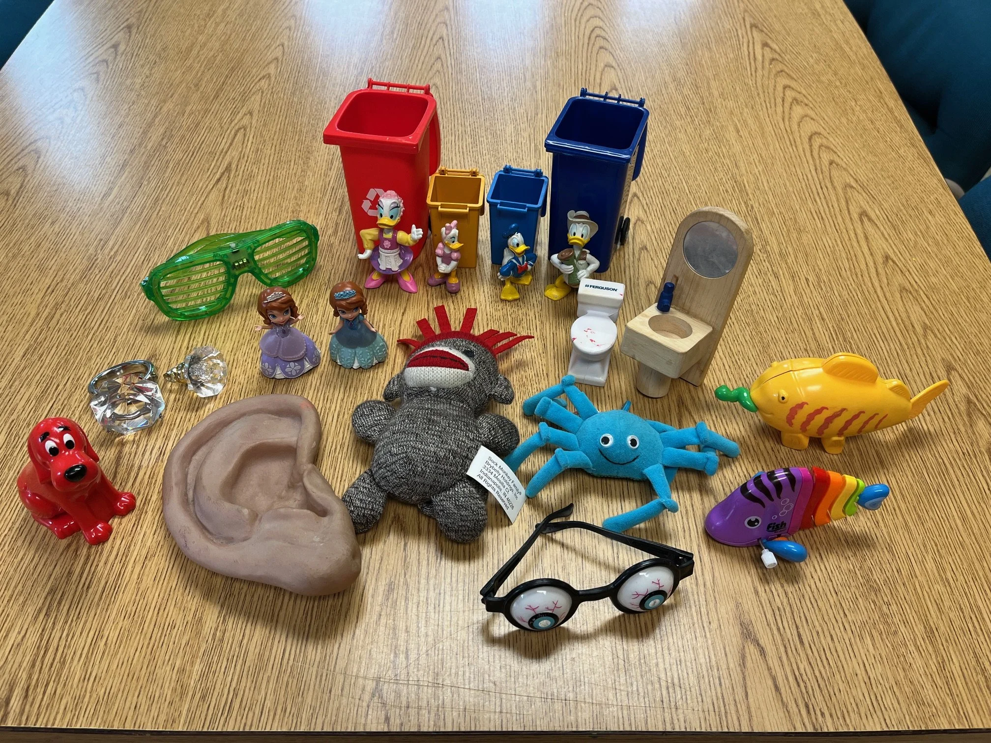 The green glasses light up and flash; the ducks live in the trash cans (Daisy’s mother, Daisy Duck, Donald Duck, Donald’s Daddy); sometimes the Ducks are found in the wrong trash can (always a mystery); Purple and Blue Sofia have arms that move - the children wave to them when the dolls wave; the two Sofia’s bend at the waist and the children bend over when the Sofias bend; when Purple or Blue Sofia need to pee, they sit on the white toilet and always use the sink to wash their hands; Sock Monkey visits occasionally and we admire his hair that stands up straight; Blue Spider has a pull string and he walks around on the rug; Yellow Fish has a pull string on the green worm - we watch him catch the worm when the string is pulled; the glasses with the bulging eyeballs help me see the children; the large ear is placed over my ear when I need the children to speak louder; the two diamond rings are very big and I wear them while I wait for my husband to buy me one for my finger - the children have told me that mine are bigger than their mommies’ rings; everyone loves Clifford.