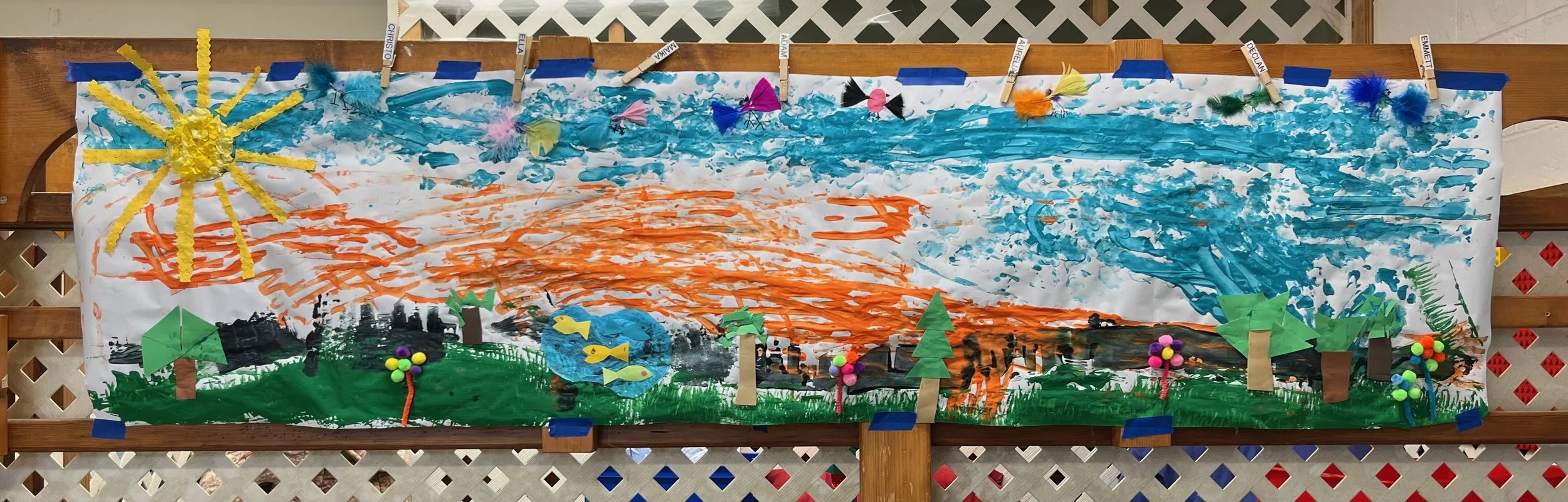 One of our favorite art projects this month was this multi-layered mural. We started by painting the background with grass, buildings and sky and kept adding from there. We asked the children what they wanted to add, and they offered several ideas. The finished product contains a sun, a pond with fish, flowers, trees and birds. We used many different tools and materials to create this piece of art. We just love it!